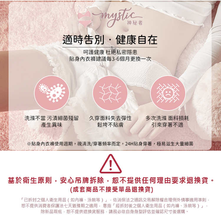 ※ 「已拆封之個人衛生用品(如泳衣/內衣褲)」,依消保法之「通訊交易解除權合理例外情事適用準則」,恕不提供七天猶豫期之適用。 ※ 意指「經拆封後之個人衛生用品(如泳衣/內衣褲)」,除商品瑕疪,恕不提供退換貨之服務,請務必依自身身型評估並確認尺寸後選購哦。 ※ 由於每台顯示螢幕出廠設定值以及個人偏好設置不同,若有些許色差屬正常現象,實際以收到實品為準。 ※ 手工量測尺寸,由於每款商品版型與彈性屬性有所差異,
